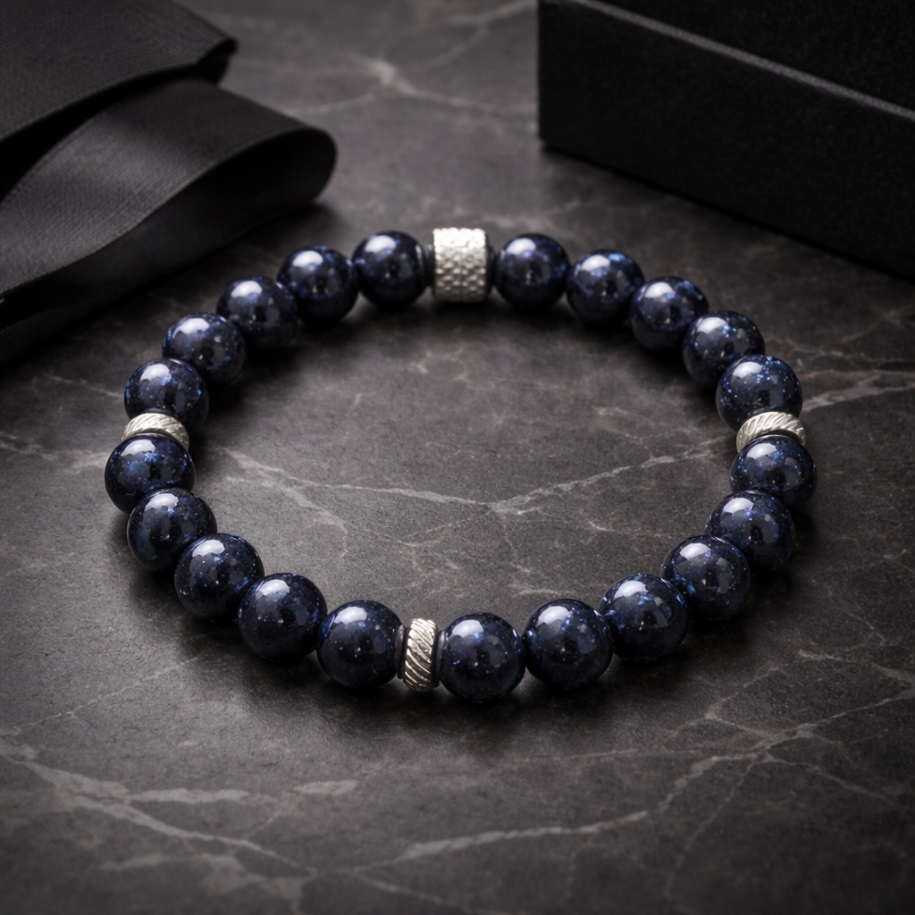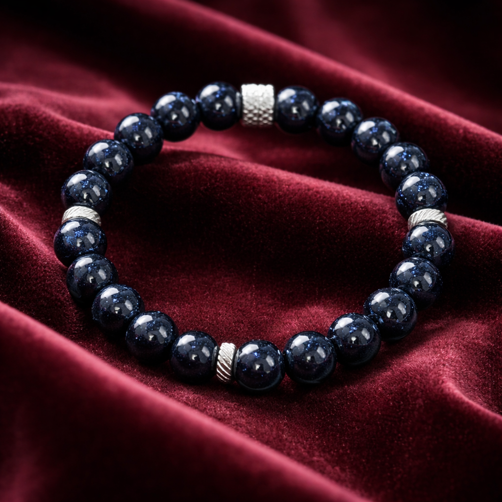 C'est un mélange d'aventurine, de cuivre et de sable de quartz qui donne cet effet scintillant. Parfois appelé pierre étoilée ou pierre de nuit, le blue Santstone possède des vertus en lithothérapie