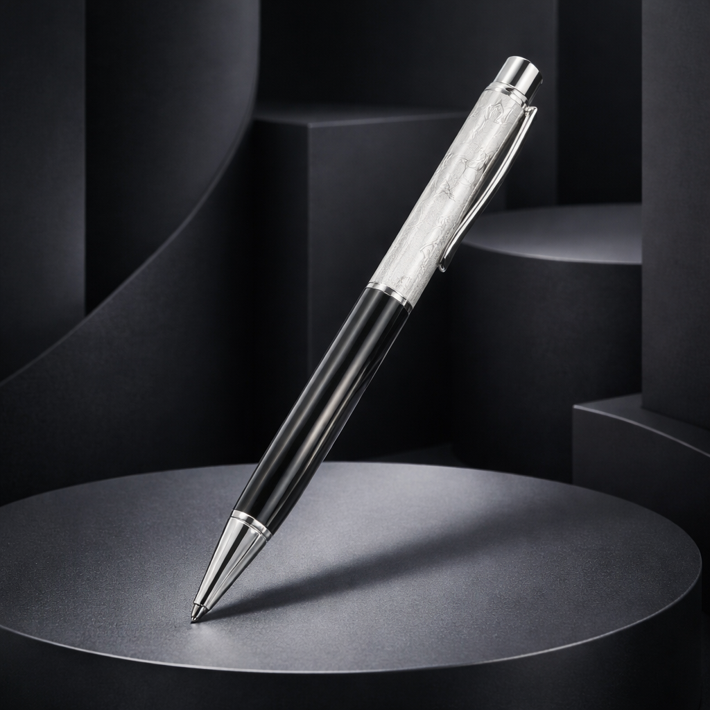 Il s'agit d’un stylo bille noir avec des pierres naturelles véritables en Cristal de roche à l’intérieur.
