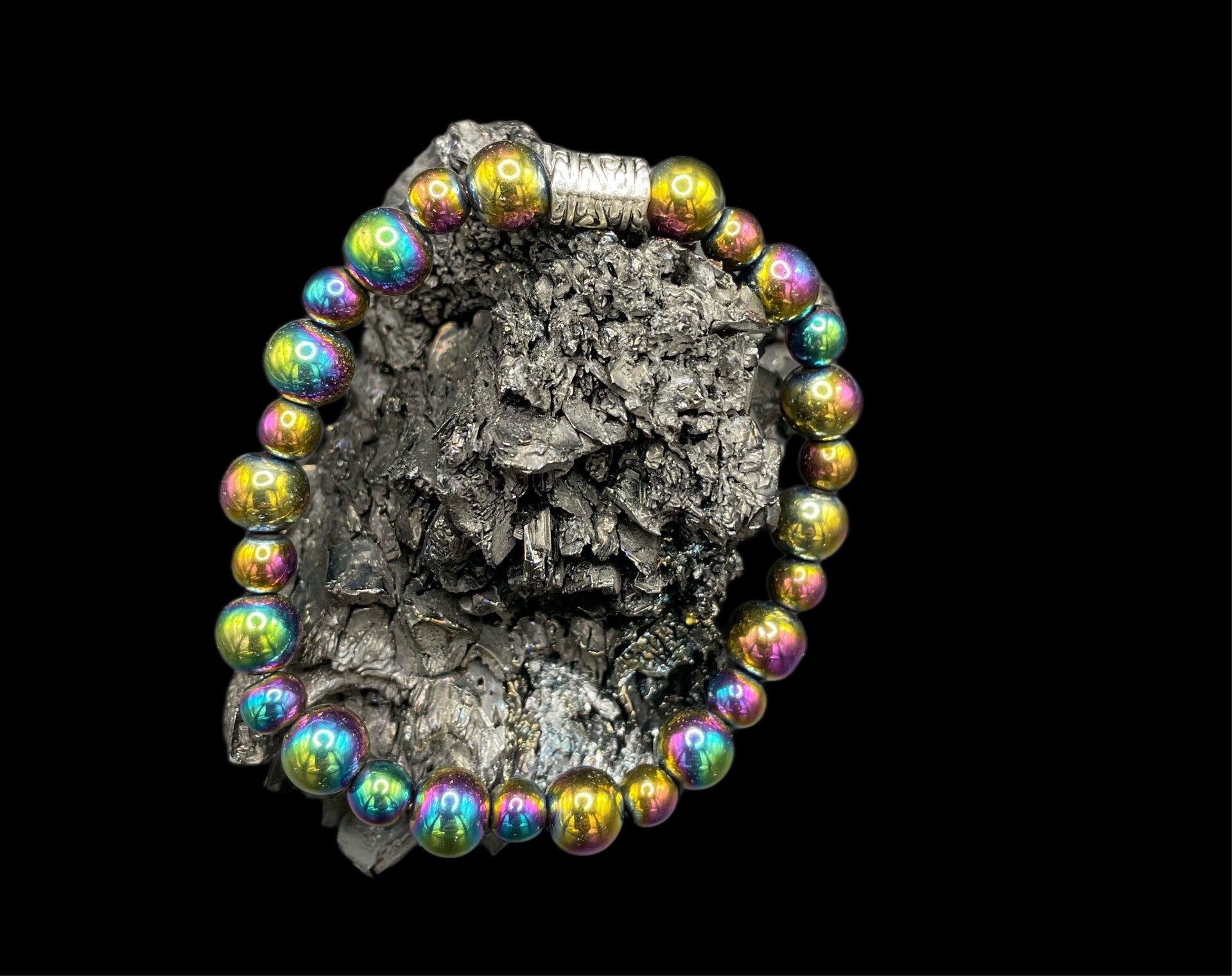 L’Hématite Titane est une pierre naturelle d’Hématite qui a été pulvérisée d’une fine couche de titane selon un processus spécifique qui permet de les fusionner au niveau moléculaire. Cette reliance au Titane offre de magnifiques reflets arc-en-ciel et amplifie les bienfaits énergétiques de l’Hématite.