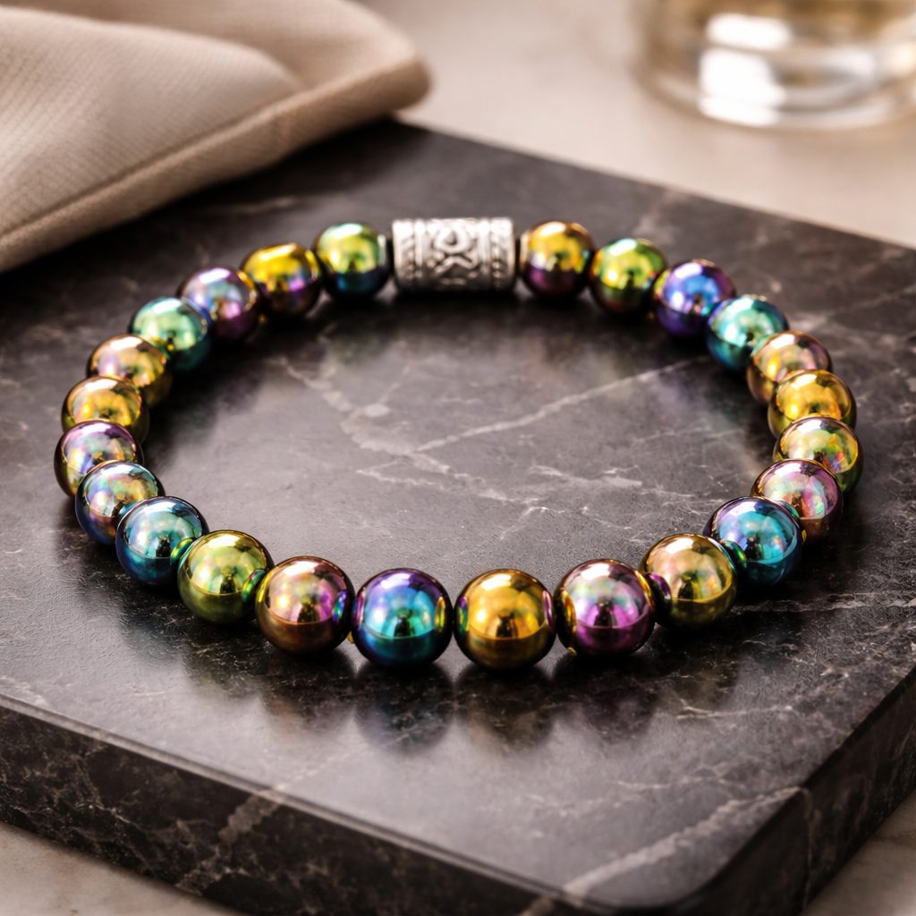 Utilisez l'hématite arc-en-ciel titane pour vous connecter à vos chakras racine et couronne, amenant votre corps entier dans alignement. L'hématite est connue pour être une pierre de base tandis que le titane est un métal de force et de vitalité. Cette puissante combinaison permet d'être présent et de faire avancer les choses.