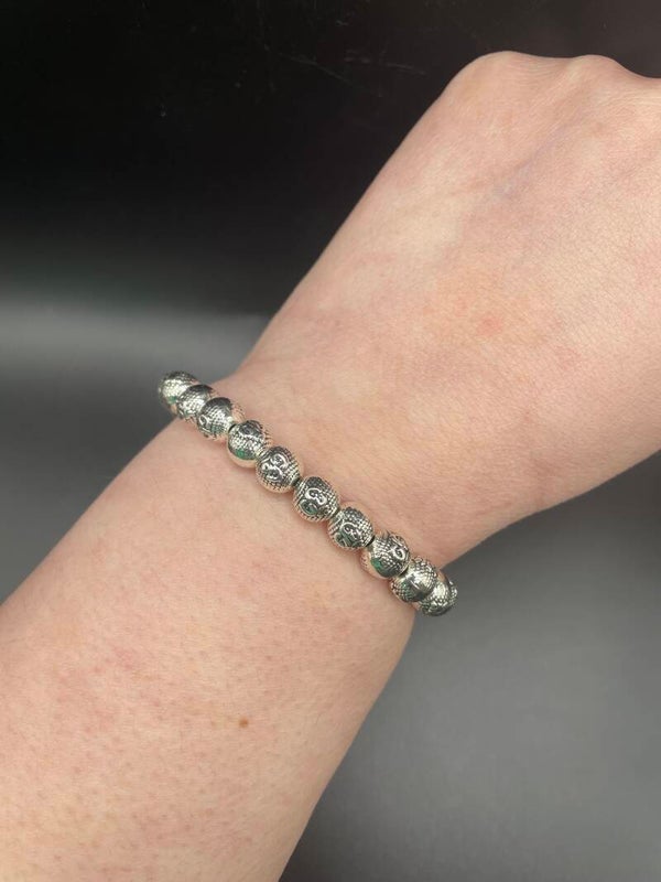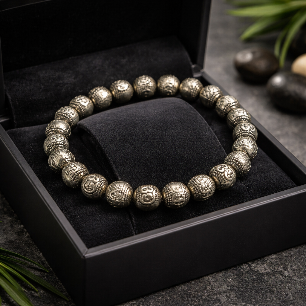 Ce bijou unique est conçu à partir de cuivre antique de haute qualité, lui donnant un aspect authentique et vieilli. Les perles de 8mm sont méticuleusement gravées du symbole sacré "Om Mani Padme Hum", l'un des mantras les plus connus et vénérés du bouddhisme. Ce mantra est une expression de compassion et est censé purifier le cœur et l'esprit, favorisant ainsi la paix intérieure et la sérénité.