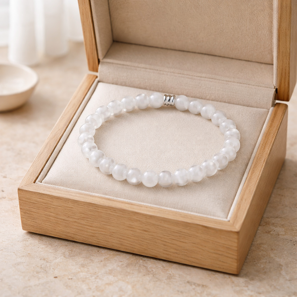 Mystique et envoûtante, la pierre de lune est une pierrequi fascine depuis des millénaires. Son nom vient de son éclat nacré rappelant la clarté lunaire, et elle est intimement liée aux cycles de la Lune, symbole de renouveau et de transformation. Déjà vénérée par les Romains, qui croyaient qu’elle était formée par les rayons lunaires solidifiés, elle était également une pierre sacrée dans la tradition hindoue, censée apporter prospérité, amour et développer la fertilité du couple. En Orient, elle ornait les parures des voyageurs, car elle était perçue comme un taliman de protection sur les longues routes.