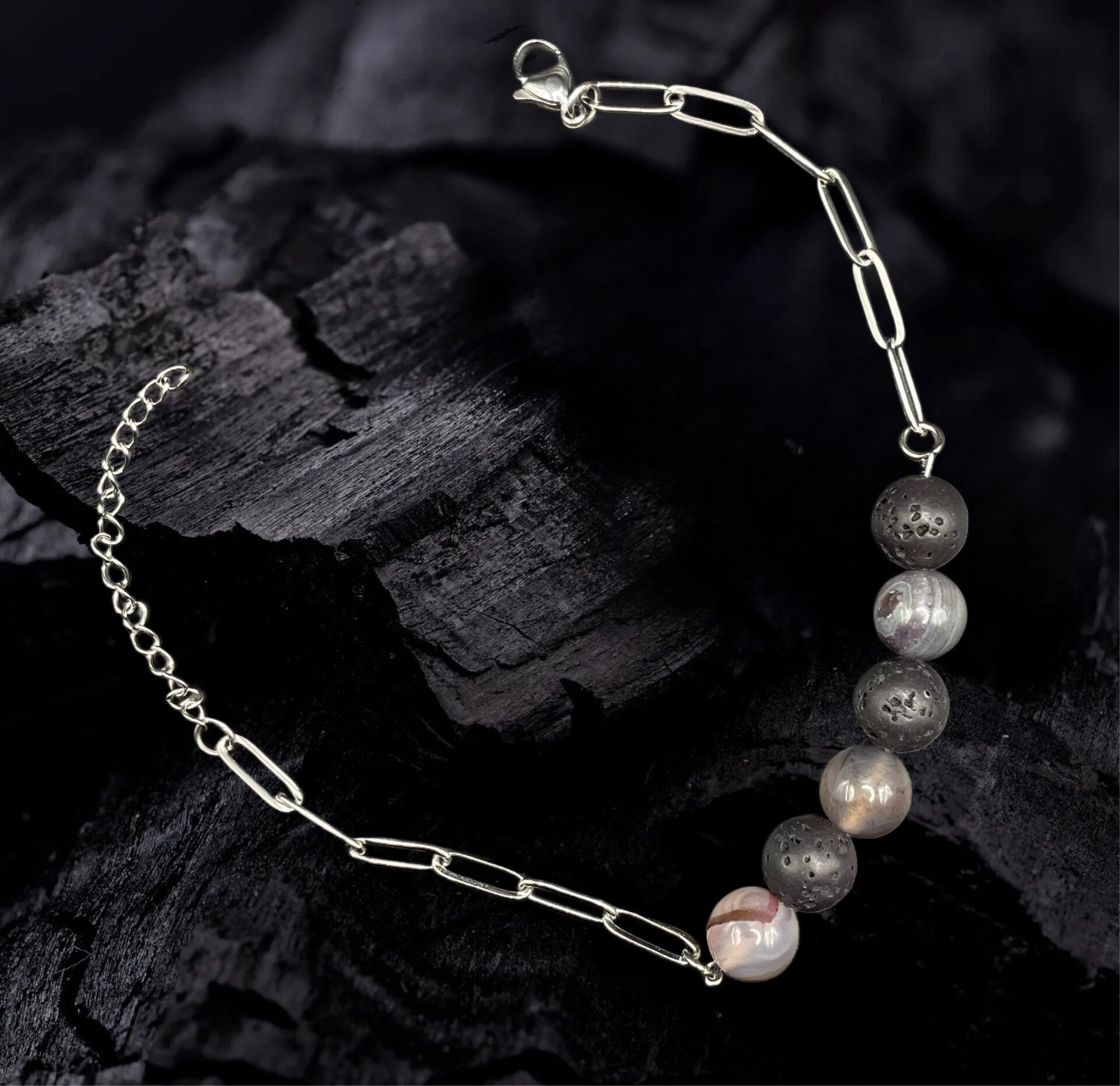 Bracelet réglable acier inoxydable pierre de lave et agate du botwsana 10mm