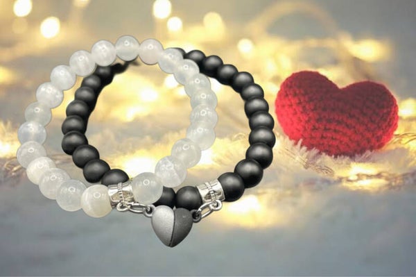 Composé d'un bracelet en sélénite et d'un bracelet en onyx Matt relié par un petit coeur magnétique, il est parfait pour les couples qui souhaitent que leur relation reste forte et durable.