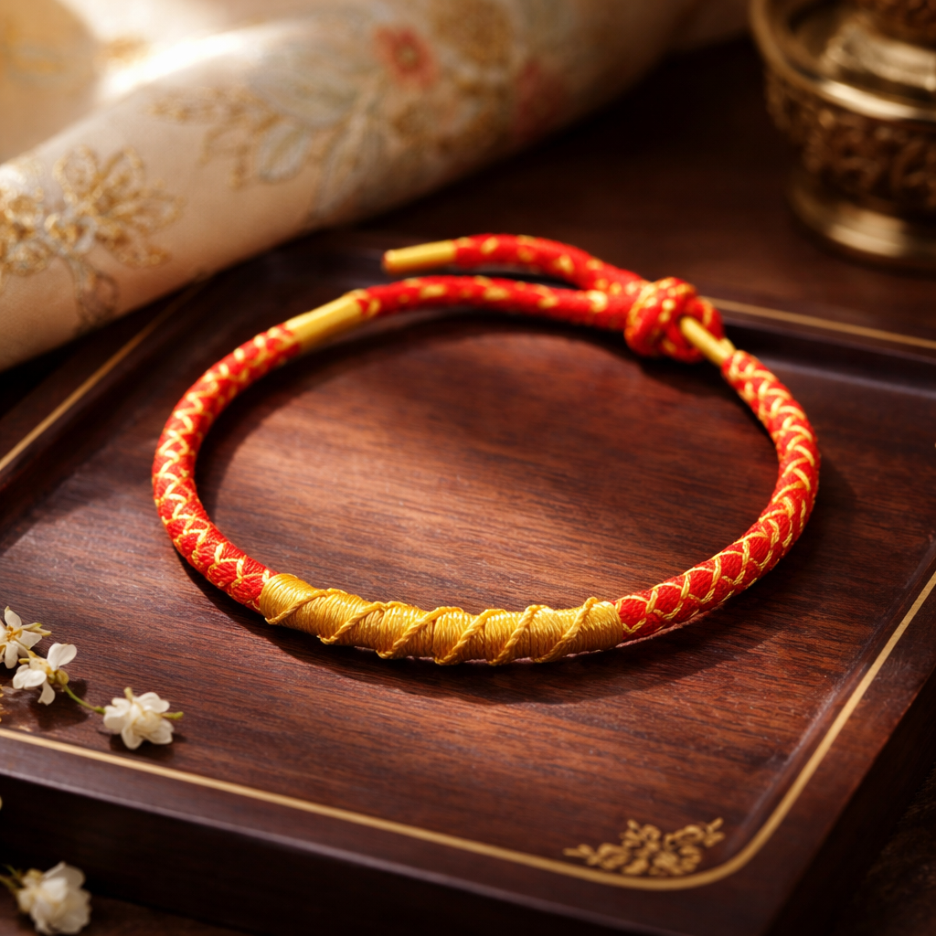 Ce bracelet tibétain en fil rouge et fil doré, orné d’un nœud traditionnel en écailles de dragon, incarne l’alliance entre symbolisme protecteur ancien et raffinement artisanal. Conçu comme un bijou d’intention, il accompagne le quotidien en rappelant force intérieure, équilibre et connexion spirituelle.
