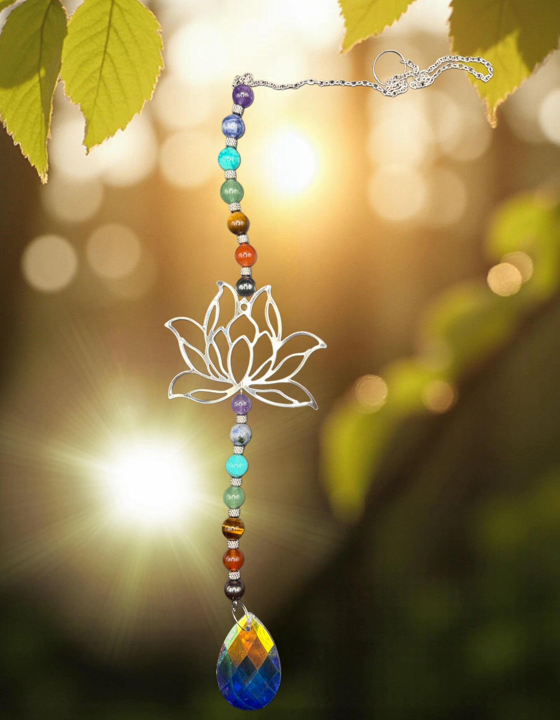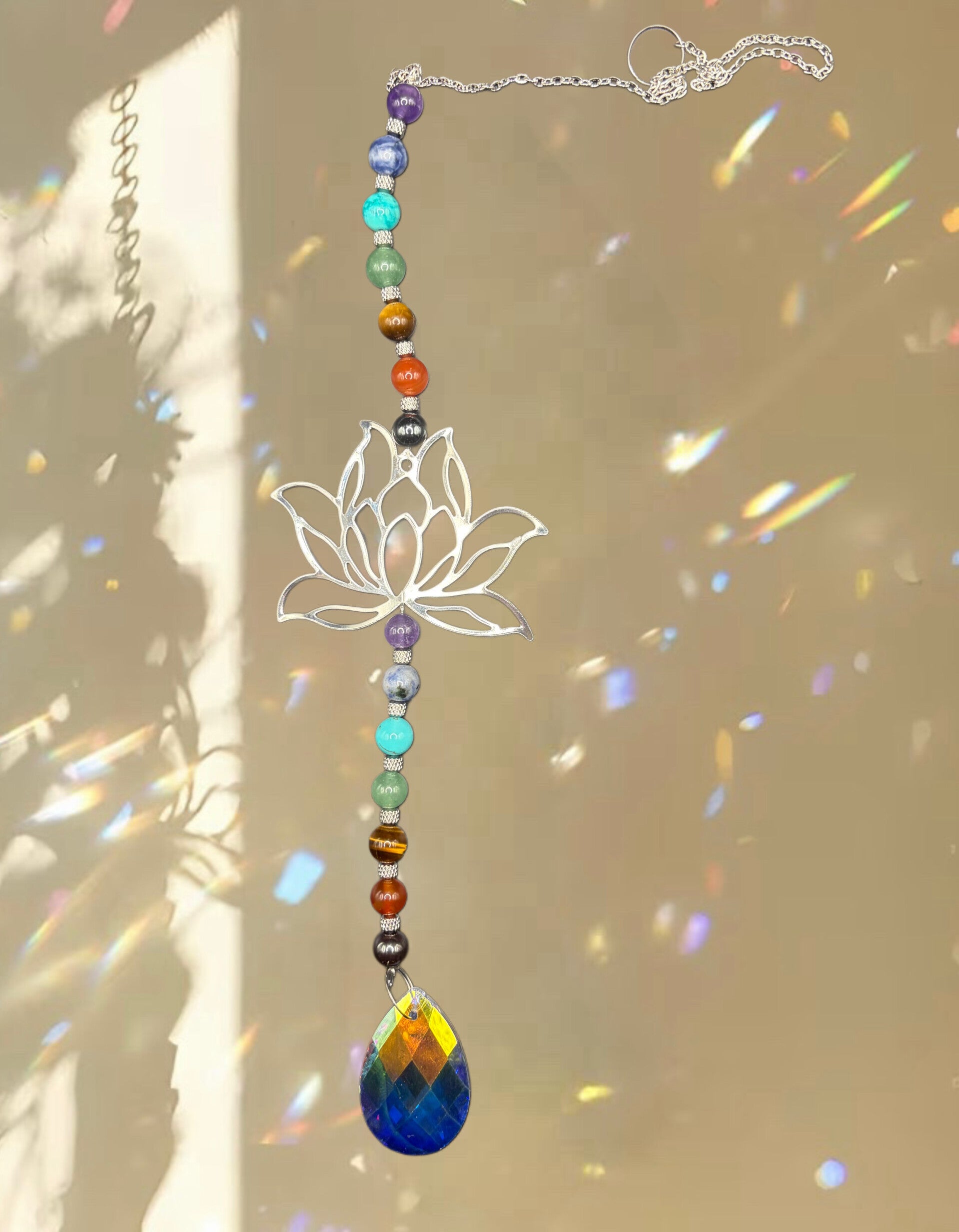 Les symboles des chakras et les 7 cristaux colorés qui le composent sont placés de manière verticale pour faire écho à l'alignement des 7 chakras le long de la colonne vertébrale.