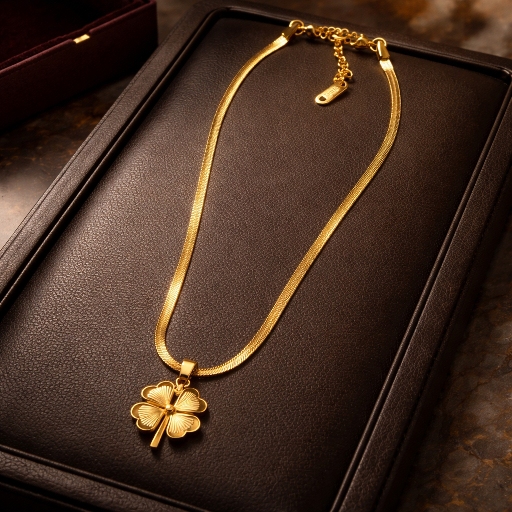 Pendentif trèfle à 4 feuilles avec chaîne serpent dorée
