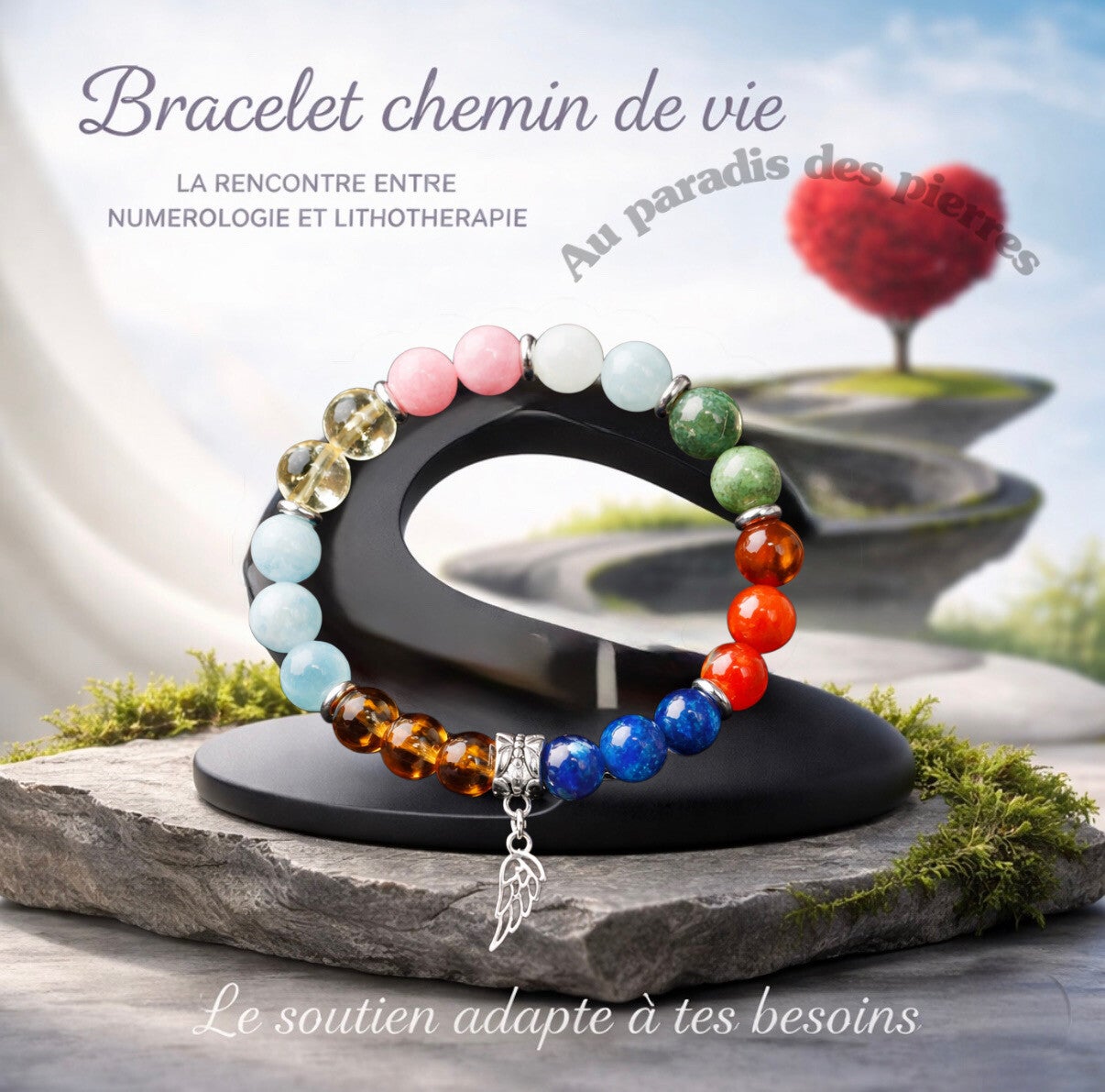 Le bracelet chemin de vie ressemble à un bracelet ordinaire, et pourtant, il est doté de plusieurs pierres sélectionnées en fonction de ton thème numérologique.