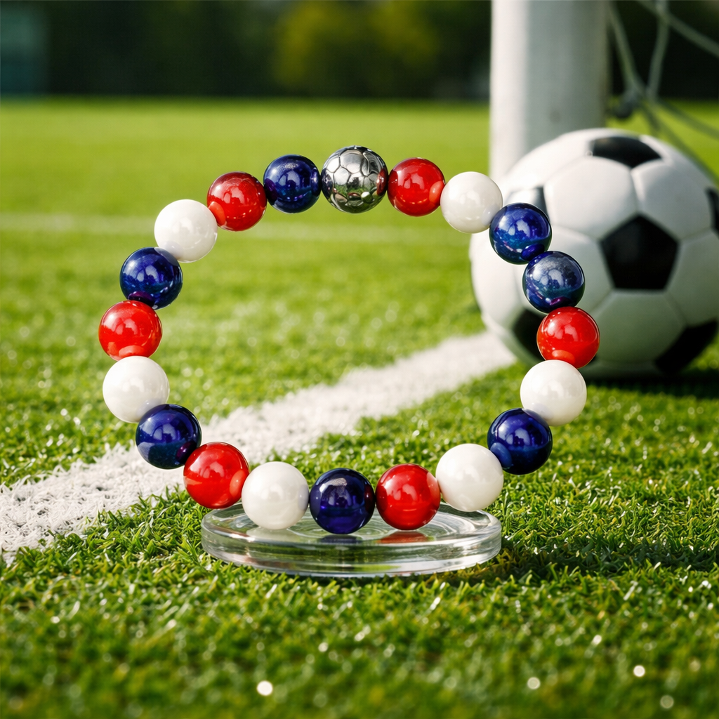 Il s’agit d’un bracelet en perles naturelles ÉQUIPE DE FRANCE DE FOOTBALL.